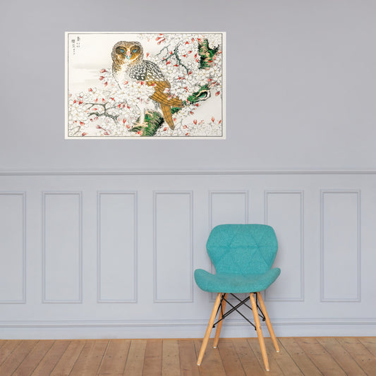 Short Eared Owl and Cherry Flower Illustration by Numata Kashu Photo Paper Poster